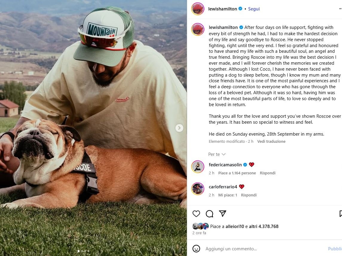 Negli ultimi giorni il mondo della Formula 1 è stato attraversato da un dibattito che ha ben poco a che fare con cronometri, pneumatici e telemetrie. Lewis Hamilton, sette volte campione del mondo, ha scelto di non presentarsi alle prove Pirelli, e forse salterà persino il Gran Premio di Singapore, per restare accanto a Roscoe, il bulldog inglese che da tredici anni condivide con lui trionfi, sconfitte e quella quotidianità che raramente i riflettori catturano.